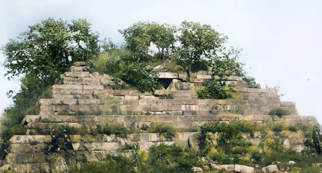 这叠台一样的石砌高台叫大将军冢,层层回收,石缝里钻出草和小树,近看每块石头的边都被岁月磨圆了,静静立在山脚,像是把一段很长的故事压在下面。