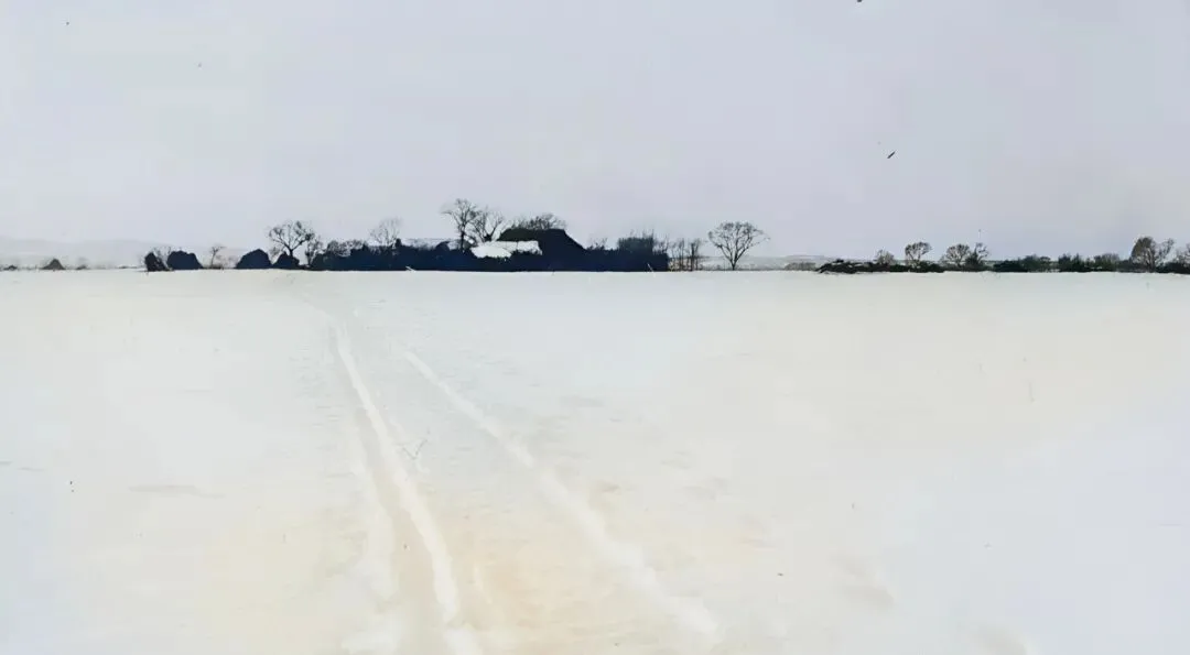 这张是雪野上两条直直的车辙,尽头是一排黑瓦白墙的房子,风把雪吹得像细盐一样往脸上打,小时候我们也爱在这样的地上踩一脚,咯吱一下,回头看看自己留下的那串印子。