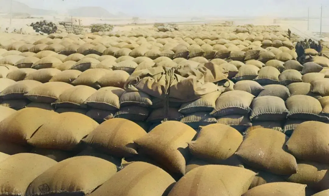 这片鼓鼓囊囊的是粮袋子,麻包口用麻绳一勒,整齐码开像一片起伏的小丘陵,墙里是粮栈,墙外是大道,冬天里有人把手缩进袖筒里站着歇口气,卖柴禾的靠墙蹲下把背篓挪了挪。