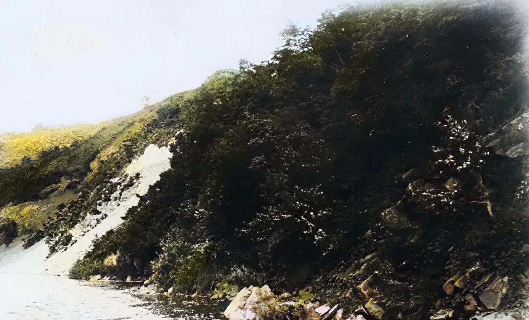 这处陡崖靠着浑江,白色崩塌面像被刀削过一样,树在上面扎根,风里叶子背面发亮,江水贴着脚边过去,带着股子冷劲。