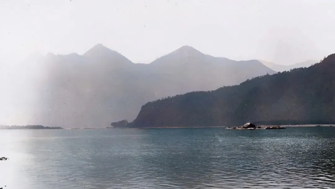 这一湾静水把山影扣在水里,远处三四个尖顶排成一线,江面只留下一点点木排的黑影,风把水皮推得细细起波,像有人悄悄在耳边说话。