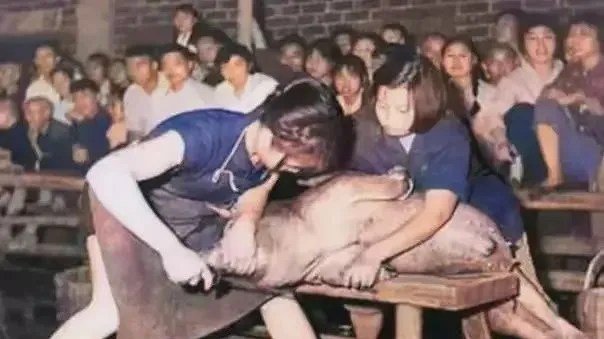老照片集:50年代,女青年杀猪干脆利落,看呆了周围的群众。