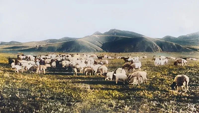 图里这一大群是牛羊,像撒在绿地上的白点点,背后连着起伏的山包,近处的草色发亮,羊背被风顺了一道纹,牧人跟在后头慢慢赶着,脚下的露水打湿了毡靴,这景象在巴林右旗白塔子一带常见,那时候牧场开阔得很,现在高速路一条条过去了,羊群绕着护栏走,味道就不一样了。