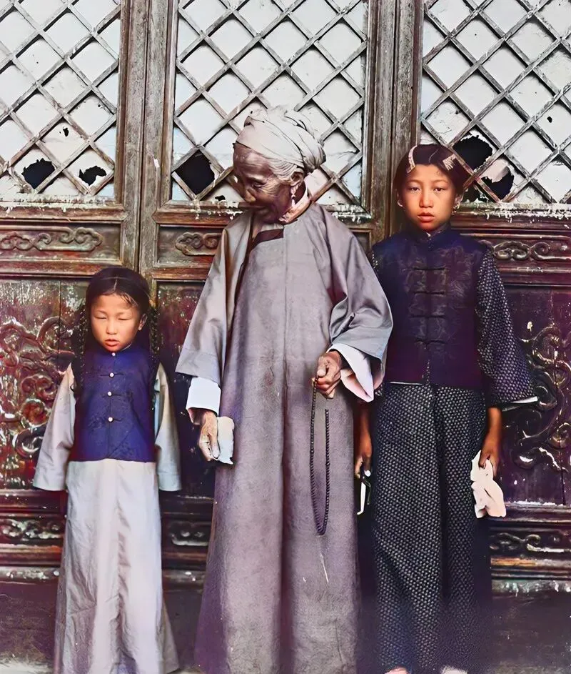 这幅合影最打动人,老奶奶手里拈着念珠,身上灰青长衫,腰背微驼,一左一右两个小孙女站得直直的,木门格子里透出斑驳的光,奶奶说别眯眼,来,看镜头,这种家门口的仪式感,现在都让手机的连拍给冲淡了。