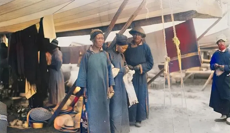 这张是帐下换卖,几位牧民在遮阳布下摸皮毛看针脚,袖口磨得发亮,掌柜递过来一条粗腰带让试一试,这种当面砍价的劲儿,现在也就赶山货节还能见着。