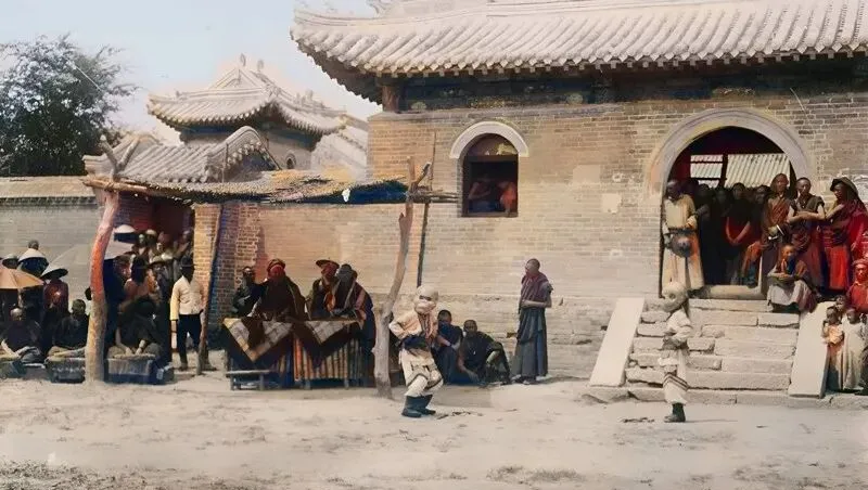这张是在荟福寺门口,查玛开演,鼓点一落,舞者转身就起,僧人和商贩挤在檐下看热闹,孩子趴在台阶边缘探头探脑,节日的热度一下子把院子烘得暖和了。