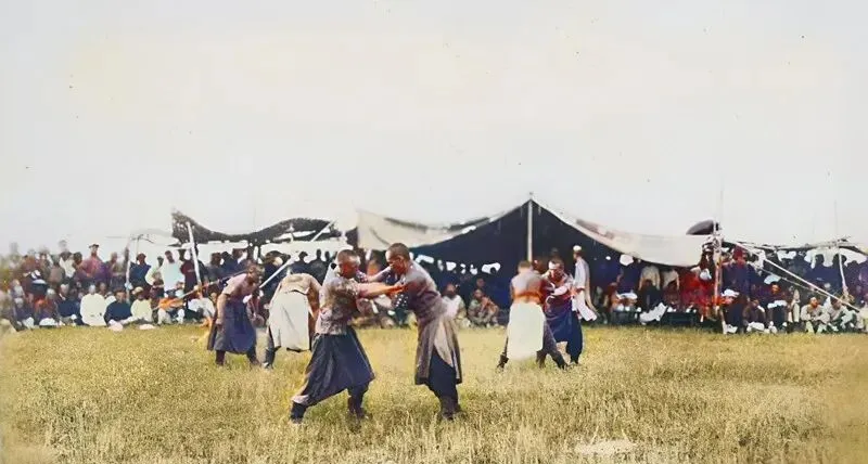 草地上正掰腕子的是那达慕摔跤,腰带勒得紧,脚下探步快,围观的人坐成半圆,口号一齐喊出来,气口足得很,如今体育场条件更好,但这股子草原味,还是在露天里最带劲。