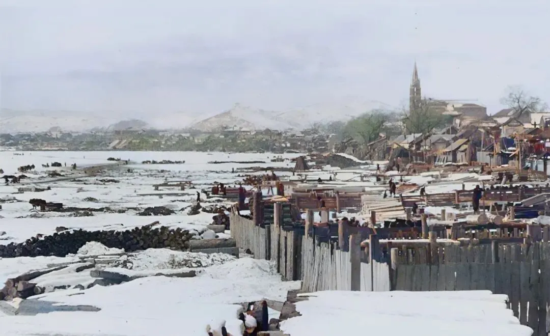 图中这片雪压的木栈叫江码头,木桩一排排扎进冻土,木料上覆着厚雪,远处露出一座尖塔的影子,江风一吹人打哆嗦,挑夫把肩上的麻绳往上拽一把,吭哧着往前挪一步,冬天的买卖全靠这几步路撑起来。