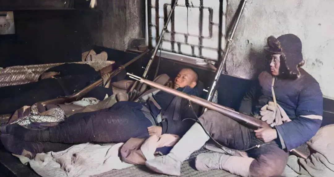 这张是火炕边的土枪,枪托斜靠着窗格,伙计裹着棉被却不敢脱靴子,睡一阵醒一阵,手心始终攥着木柄,屋里只听得棉被窸窣响,日子就是这么提心吊胆过的。