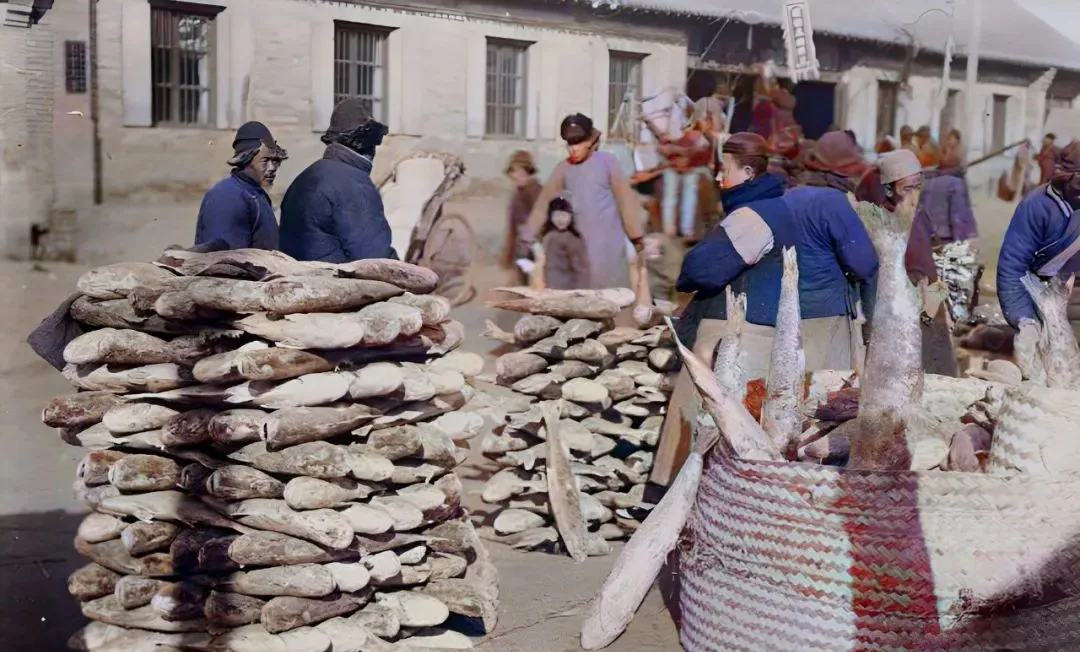 这个像小塔一样码起来的货叫冻鱼垛,二三十斤一条,硬得跟木头差不多,卖鱼的用小铁锤敲一声脆响,买主点点头,掂一下份量就成交了。