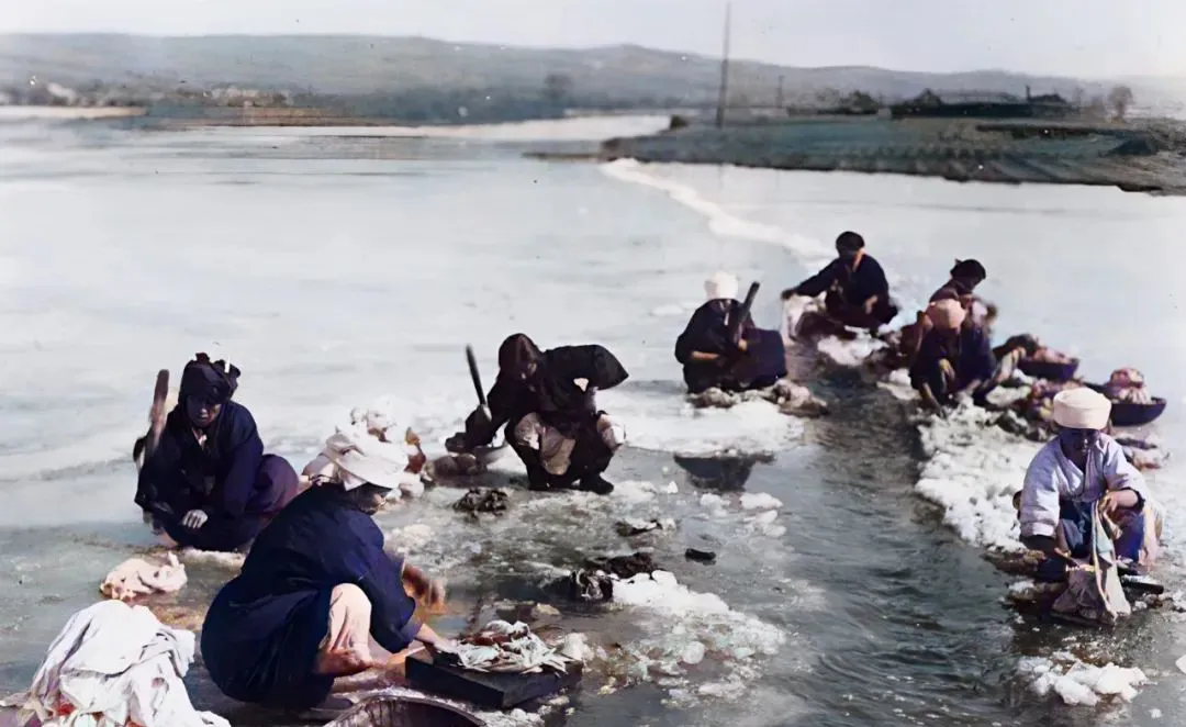 这条开在冰面上的水沟叫洗衣槽,女人们一手抡棒槌一手翻衣料,袖口全是冰碴子,妈妈说那会儿水清得能照人,可手背也冻得通红,回家得抹一层猪油才缓过来。