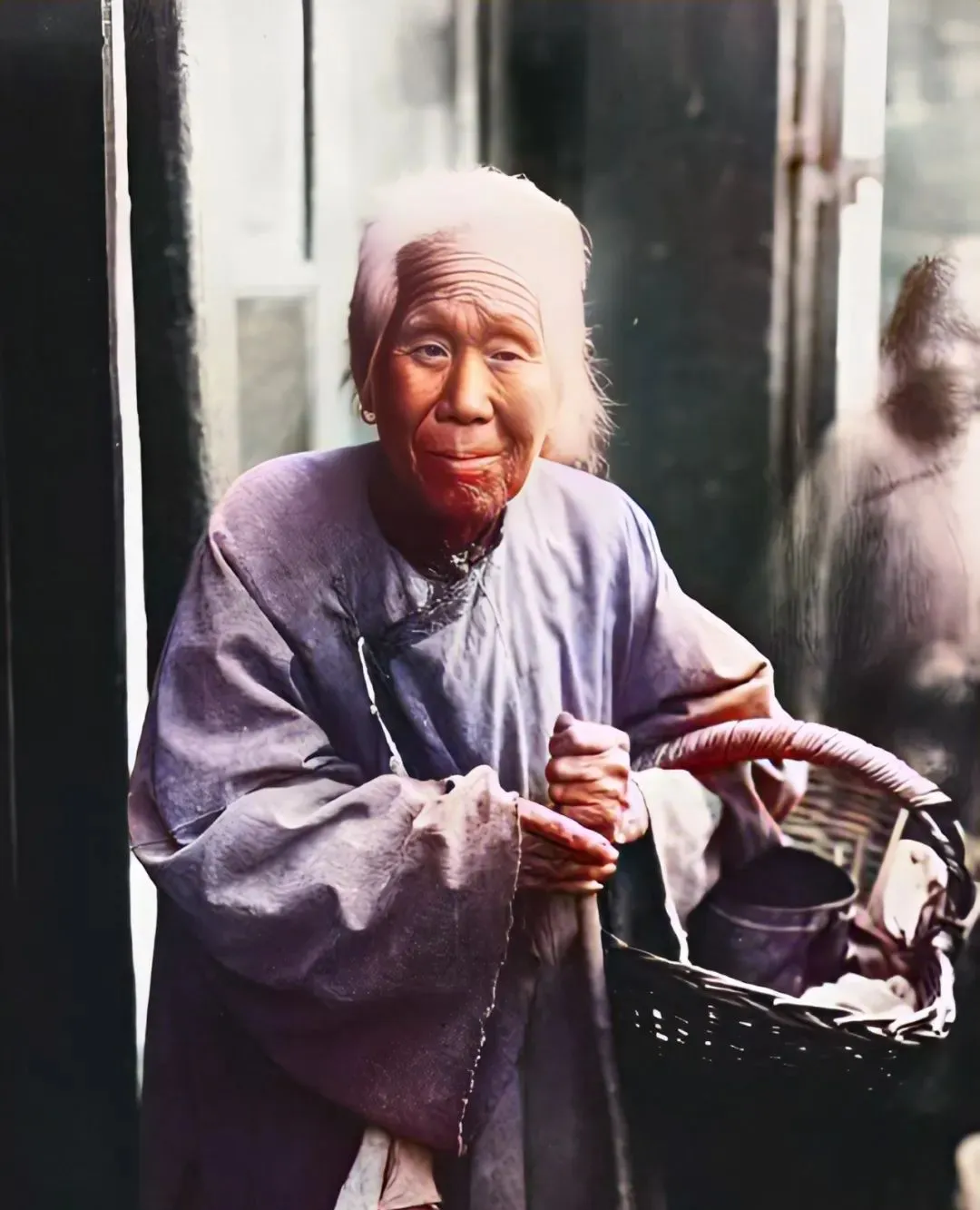 这个竹篮配铝皮饭缸,就是老大娘的家当,她把袖口一揽,轻声说口口饭吃,路人塞一团窝窝头,她连声道谢,转身还会把篮边的破布盖严一点。