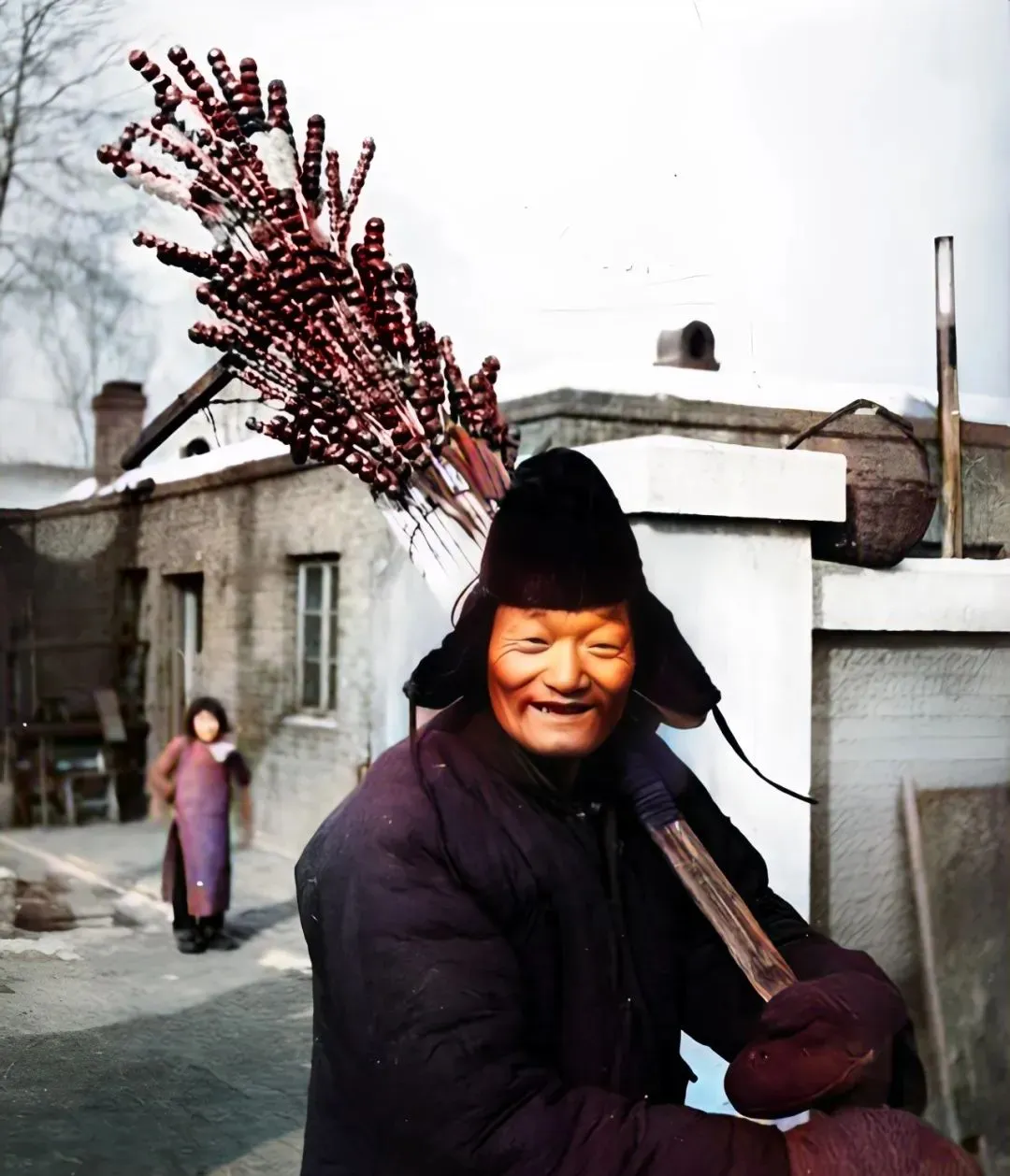 这个顶端插满红玛瑙似的家伙叫糖葫芦杆,老大爷笑得见牙不见眼,一边走一边吆喝,孩子远远地跟着喊要酸甜的那串,爷爷说那时候一串能分三回吃,甜得不舍得下嘴。