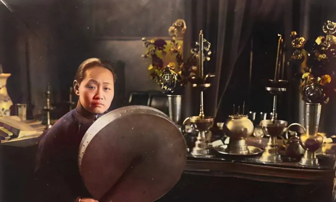 这个圆面鼓叫神鼓,女巫师双手执槌,嘴里一句句念着,案上摆满铜盏与香插,屋里灯影摇动,墙角的小孩探头看一眼又缩回去,不敢多问。