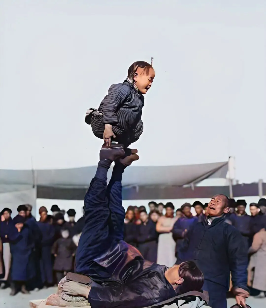 这个脚背顶娃的活儿叫倒立叠人,男人仰着身,脚面稳稳托住孩子,旁边一位抱拳吆喝,围观的人越聚越多,铜钱叮当几声落进布盅里,孩子下地后还会冲人群摆摆手。