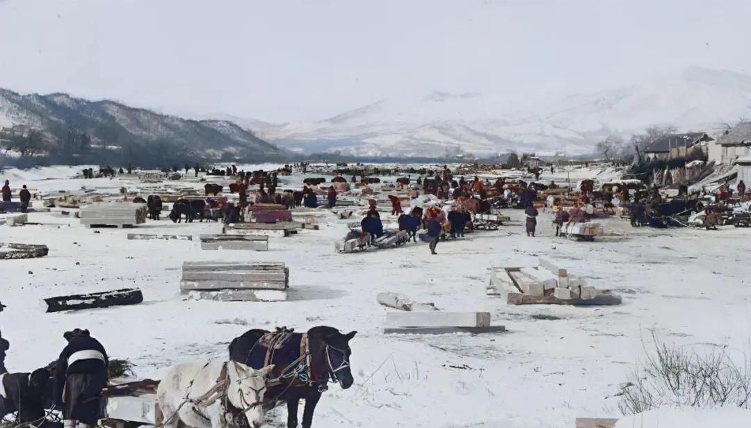 这片一块块方木摆开的地方叫冬贮木场,木头在冰面上最好拖,几匹小毛驴套着爬犁,木匠把印记敲在木头端头,等开化前一鼓作气往下游放排。