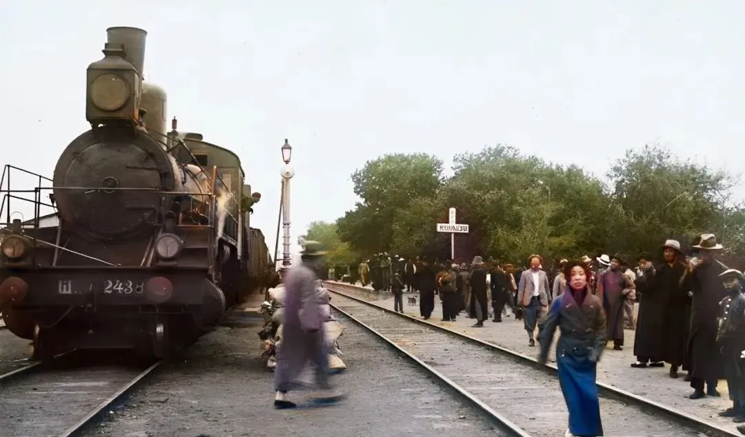 这台冒白气的家伙叫黑头机车,站台牌子立在枕木边,人群拥成两簇,搬运工肩上担子咣当一下,孩子牵着大人的衣角一路小跑,生怕错过了车。
