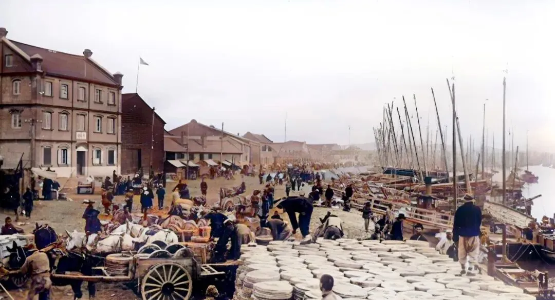 这堆圆圆的垫片样儿的是豆饼,等装船去做饲料和肥料,江堤边全是桅杆,码头上的骡车一圈圈压过去,留下深深的辙印,掌柜在簿子上划道杠说再来十车。