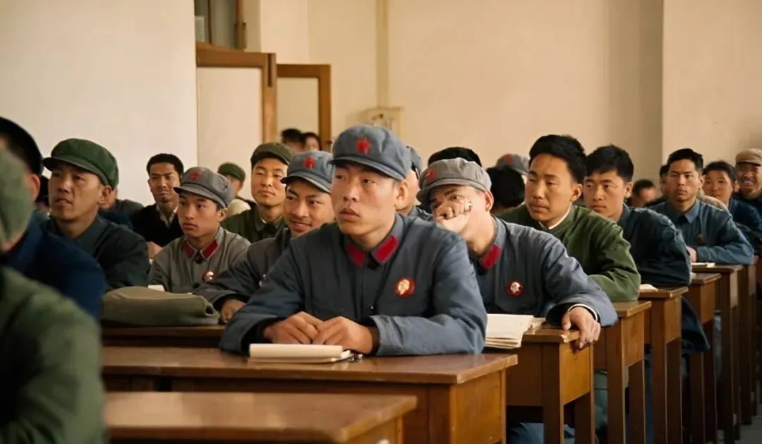 图中这间教室叫阶梯教室,木桌一排一排摆得直溜,前排同学襟前别着小圆徽,灰蓝色棉布上衣配解放帽,眼神都往黑板上盯得紧,讲台边缘有一圈磨得发亮的痕,都是粉笔擦来回蹭出来的。