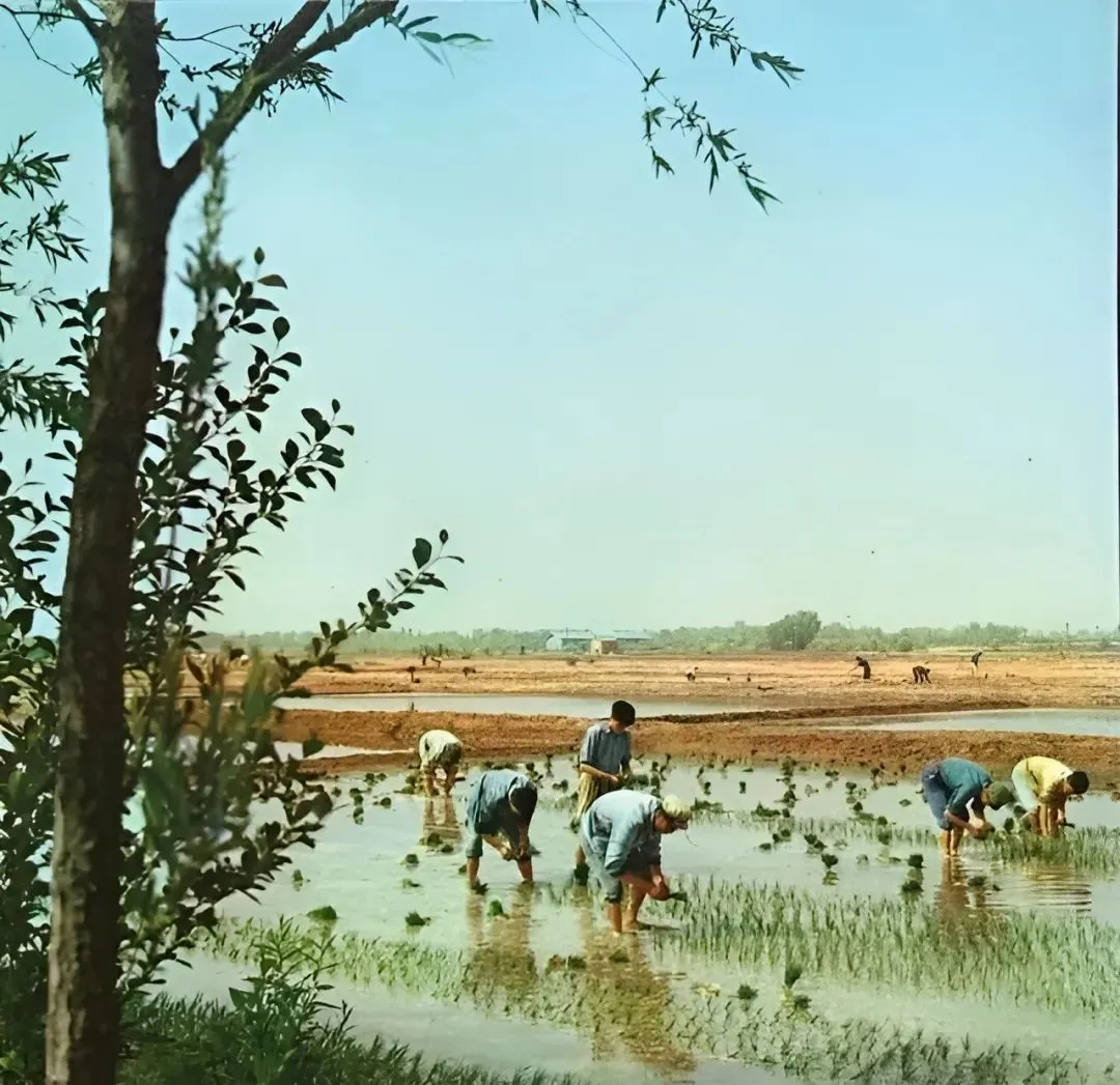 图里这片水汪汪的叫秧田,裤腿挽到膝盖,手一把一把把秧苗按进泥里,脚底下咯噔一下就是石子,太阳一晒背上发辣,回宿舍一洗脚盆里全是泥,学与做三合一,就是这么练出来的。