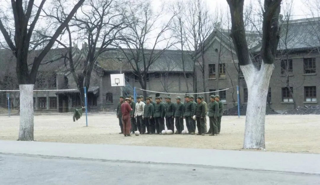 这位前排领操的叫体育干事,灰上衣扣到最上面一粒,手臂抬平,腿踢得直,后排跟着笑,风把树杈吹得哗啦响,简单,却有股子精气神。
