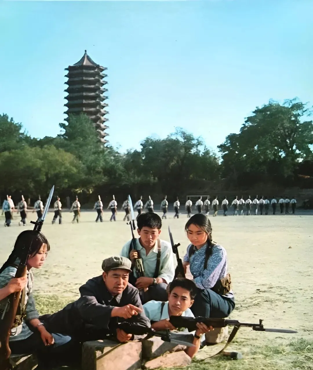 这节课叫军事体育,趴在地上学瞄准,讲究呼吸匀,扣扳机要稳,教官手指头一戳木靶的黑心,说“别抖”,远处的塔影斜着落进操场,照片一晃就有故事。