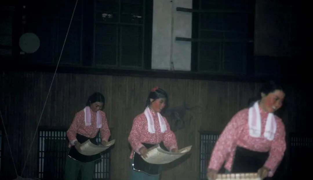 这回篓子叫簸箕,姑娘们穿粉花上衣,脸颊抹了红,动作一合一放,跟着节拍摆动,台下乐队“咿呀咿呀”一串儿进来,热闹得很。