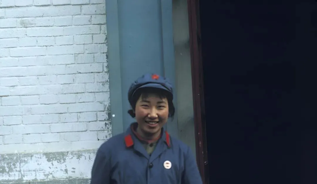 这位姑娘戴着五角星帽徽,蓝灰色工作服领口两块红呢子,笑得爽利,眉眼一弯像月牙,照片一看就开心。