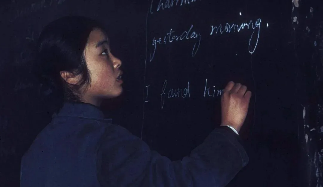 这行字叫粉笔体英文,yesterday的y拉得很长,字贴着黑板纹理走,手在空中一停再落,老师在旁边嗯了一声,点点头,这堂英语课就算收尾了。