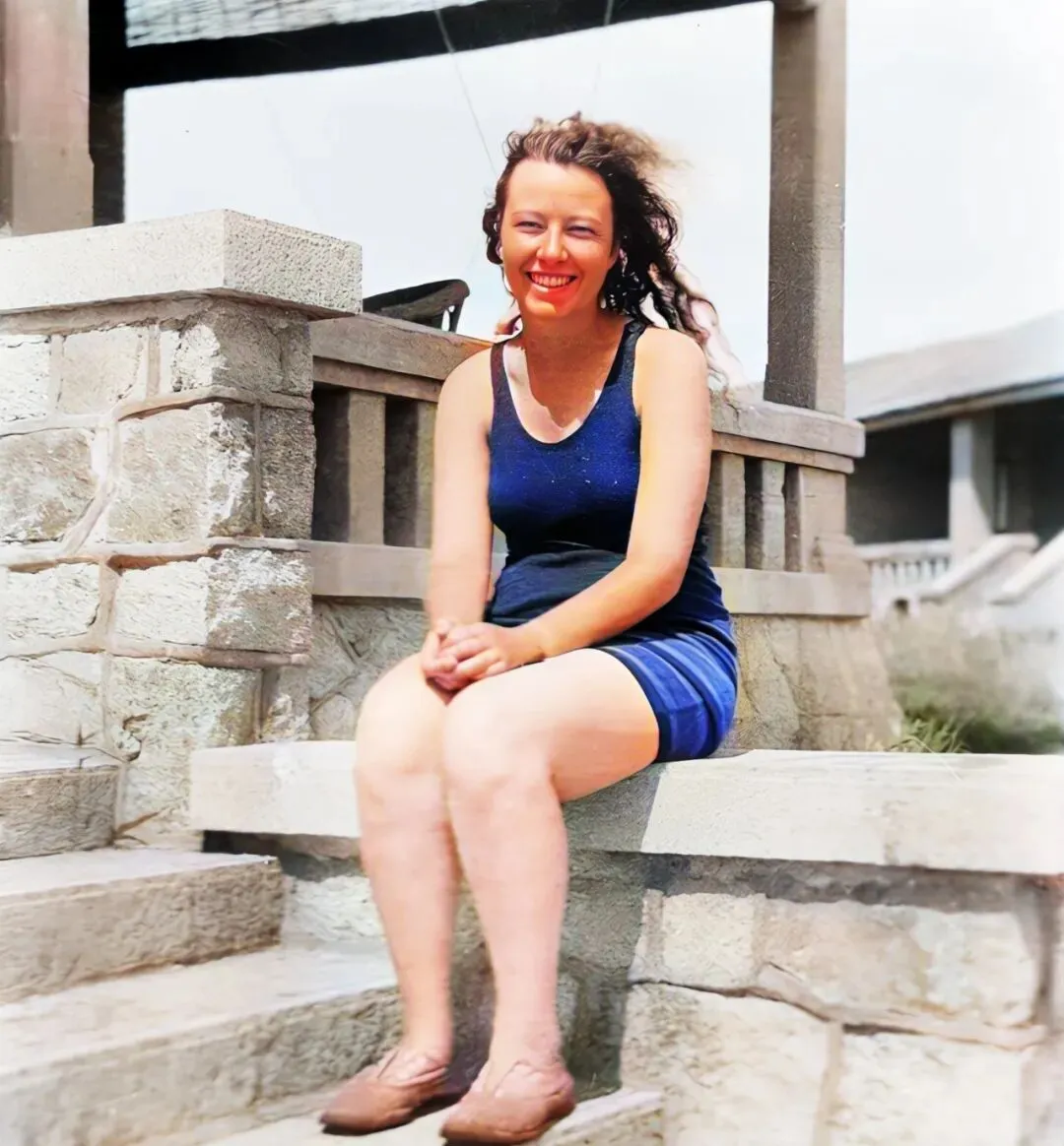 图中年轻女子坐在石头台阶上,这个轻巧的背心配短裙的装束叫海滨便装,蓝得干净的颜色贴着夏天的光,短发被风一拨一拨的,鞋子是软皮平底,脚背上还有细褶,笑容开到眼角,像谁在镜头后举了个小手势逗她,她就忍不住笑开了,石栏的毛边还在,阳光从屋檐下泼下来,照片一暖,那个暑气腾腾的1927年就活了。