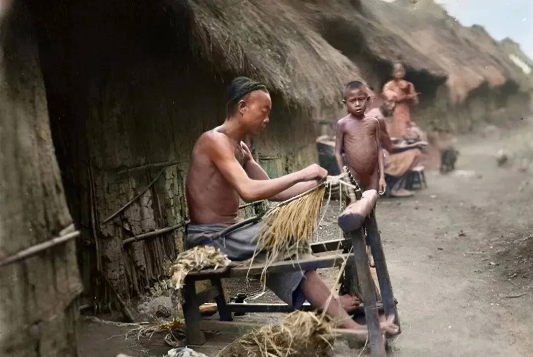 这个坐着忙活的活计叫编草绳,木架横在膝上,手指蘸着唾沫一拧一撮,稻草顺着掌心走,细丝被拽得服服帖帖,男主人光着上身,后背一块亮一块暗,脚趾扣着地,旁边的孩子肚皮鼓鼓的看得出刚吃过饭,屋檐是厚厚的茅草,风一过会“沙沙”响,爷爷说,那时家里的绳子都是自己拧出来的,晾谷子绑柴禾,全靠它。