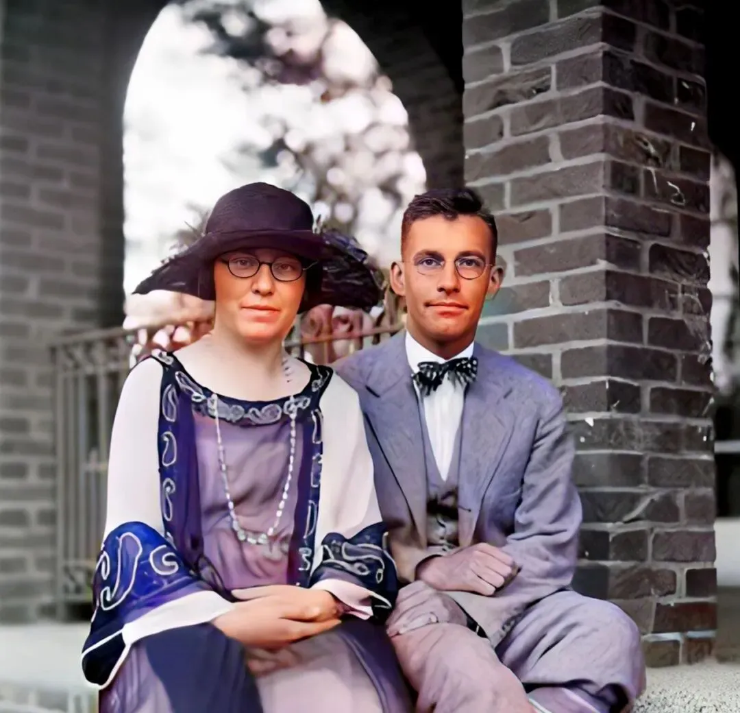 这个并肩坐着的叫夫妻合照,一黑一灰两套衣料把调子压住,眼镜框像两道小括号,眉眼里都是新婚的笃定,照片边角有点虚,像是在微风里晃了一下,后来他们在中国走南闯北,北海的白塔照过影,天坛的回音听过响,雍和宫前晒过冬日的太阳,走到哪儿就把哪儿装进底片里,有些城市变了个样子,可他们那时按下的快门还在。