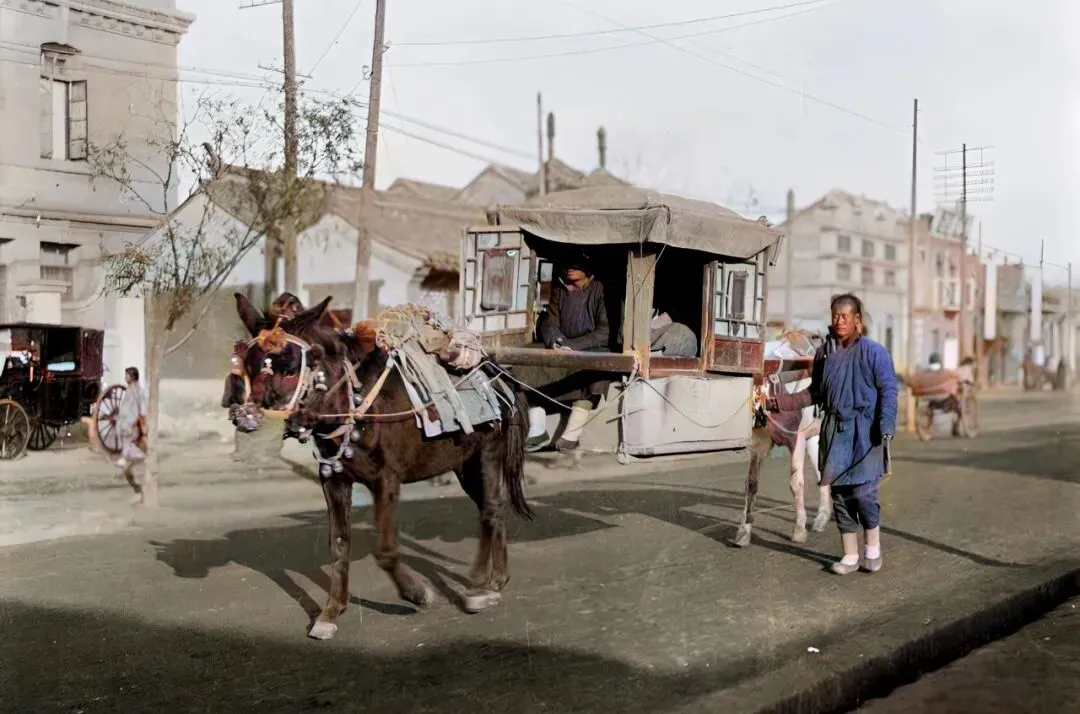 这个两头牲口拉着的叫骡车,车厢木板做骨,侧面开了小窗,车夫靠窗探着身子,前头的骡子挂着串铃,走起来丁零作响,路边店铺的门脸低低的,电线杆把影子拉得老长,行人裹着蓝布大褂慢慢走,妈妈说,小时候赶集就是坐这种车,颠得人直发笑,可好在遮风挡雨,那时候的速度慢,但人心不慌。