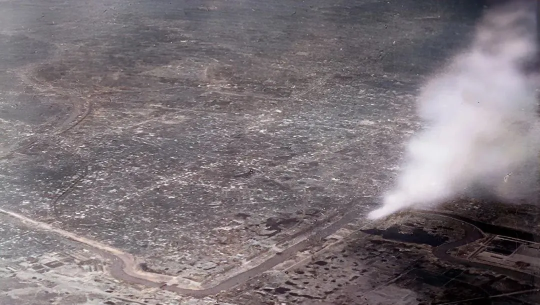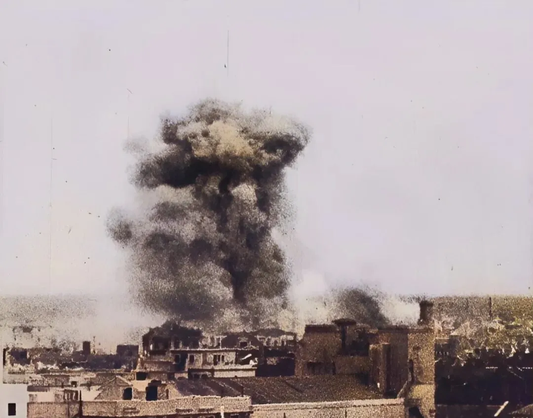 这个烟团叫爆震云,像打翻的墨砚,一朵黑蘑菇在屋脊上炸开,附近的窗框全被震得外翻,砖灰子从半空里沙沙往下落,喊声被压得死沉。