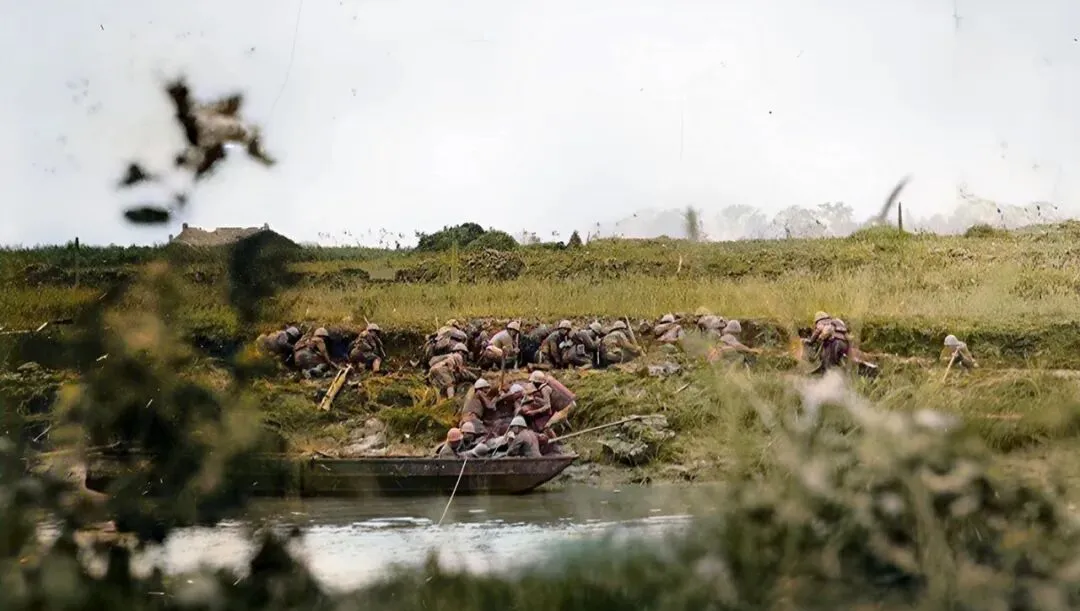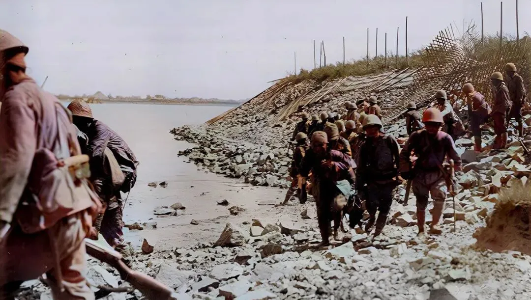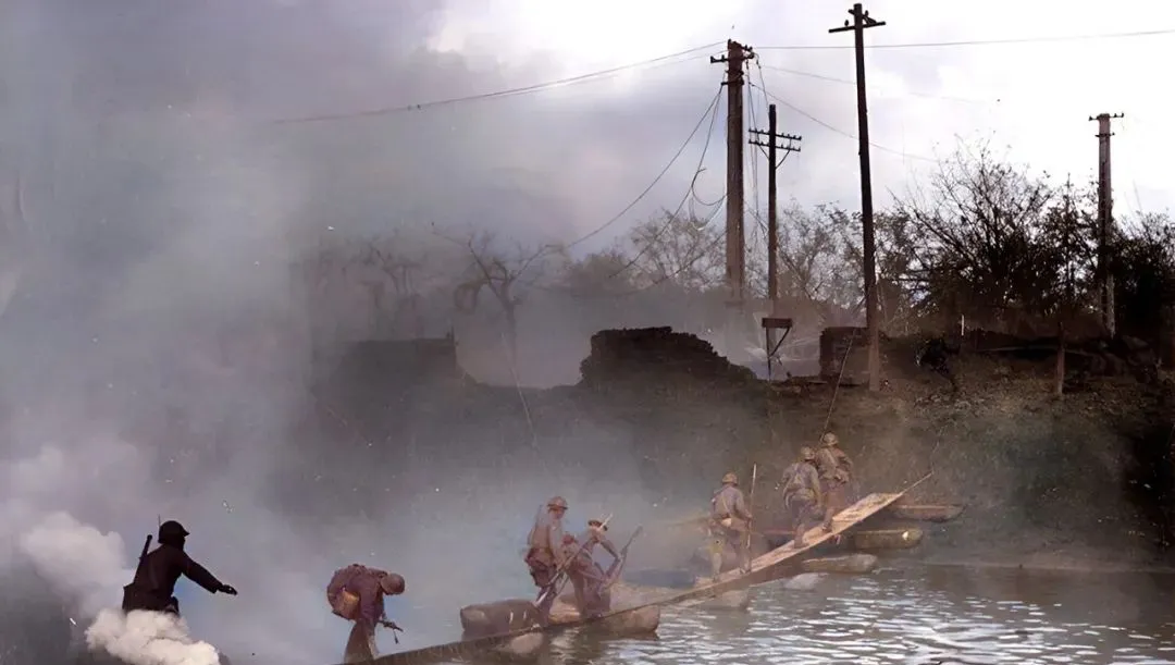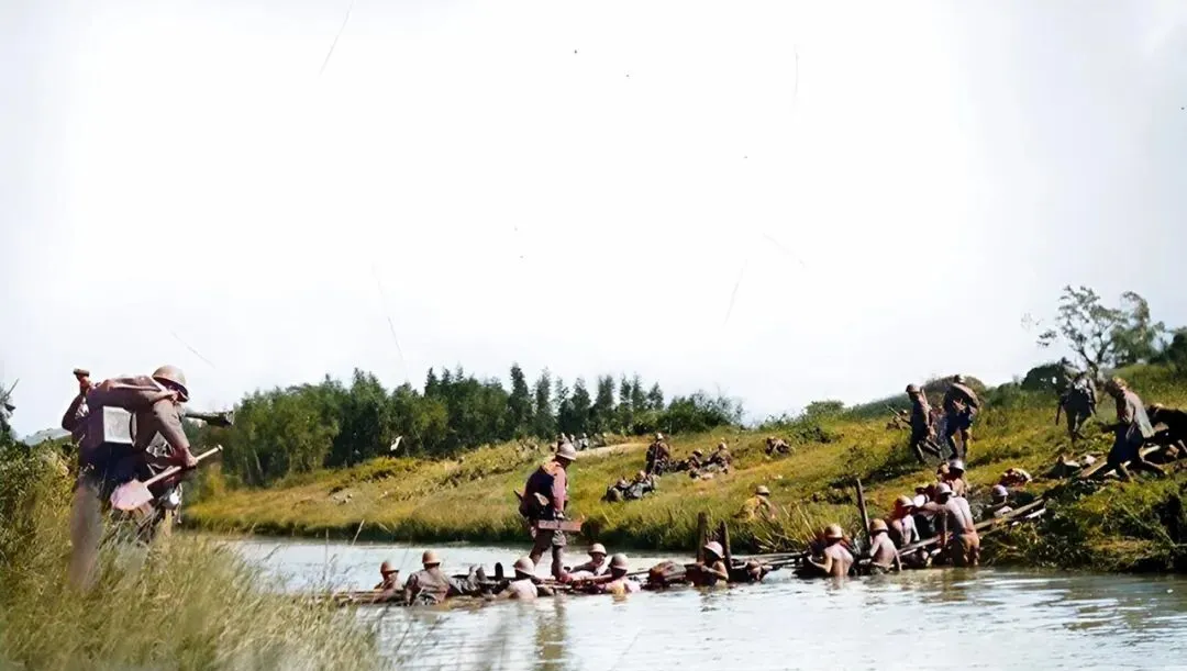 图中木排连成一线,喊号子的在前,身后背枪的人两手扒水,水花不大,却急,等靠上对岸,就有人趴倒在草根下换气,动作利索得像练过千万遍。