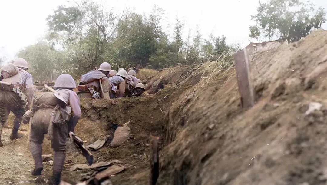 这张看的是壕沟,蜿蜒着没个头,沟壁潮湿,泥一粘就拖鞋,队伍像一条灰色的蛇,腰背起伏着往前拱,偶尔有人把铁锹柄当拐子撑一把。