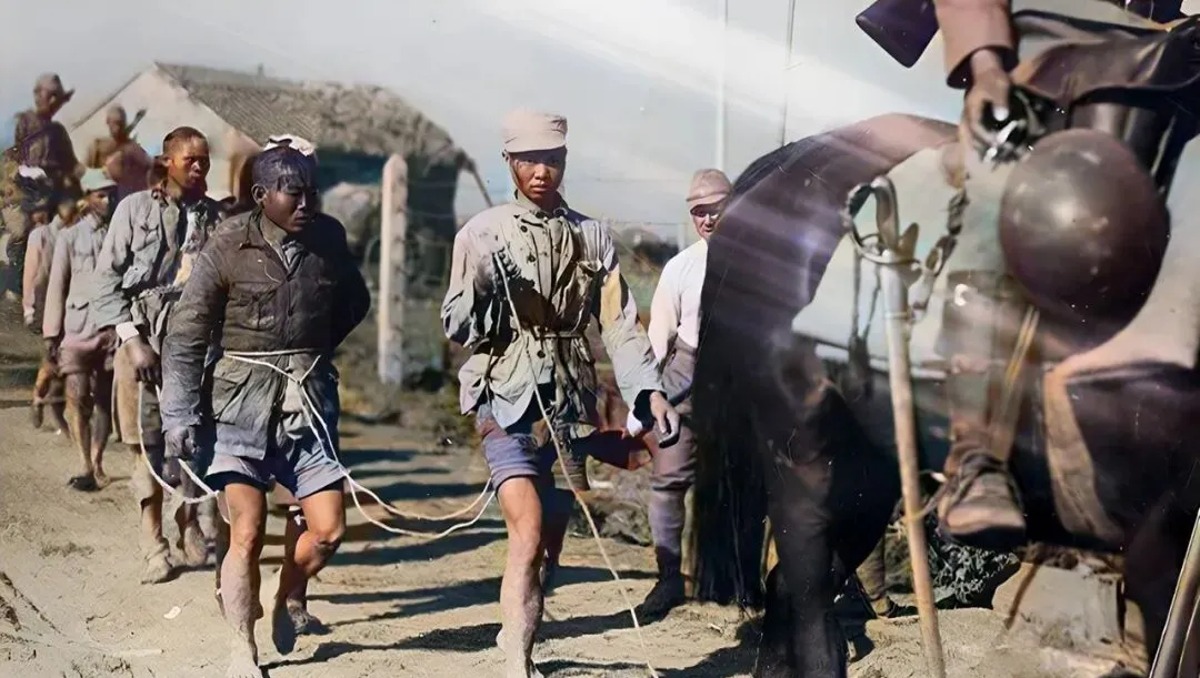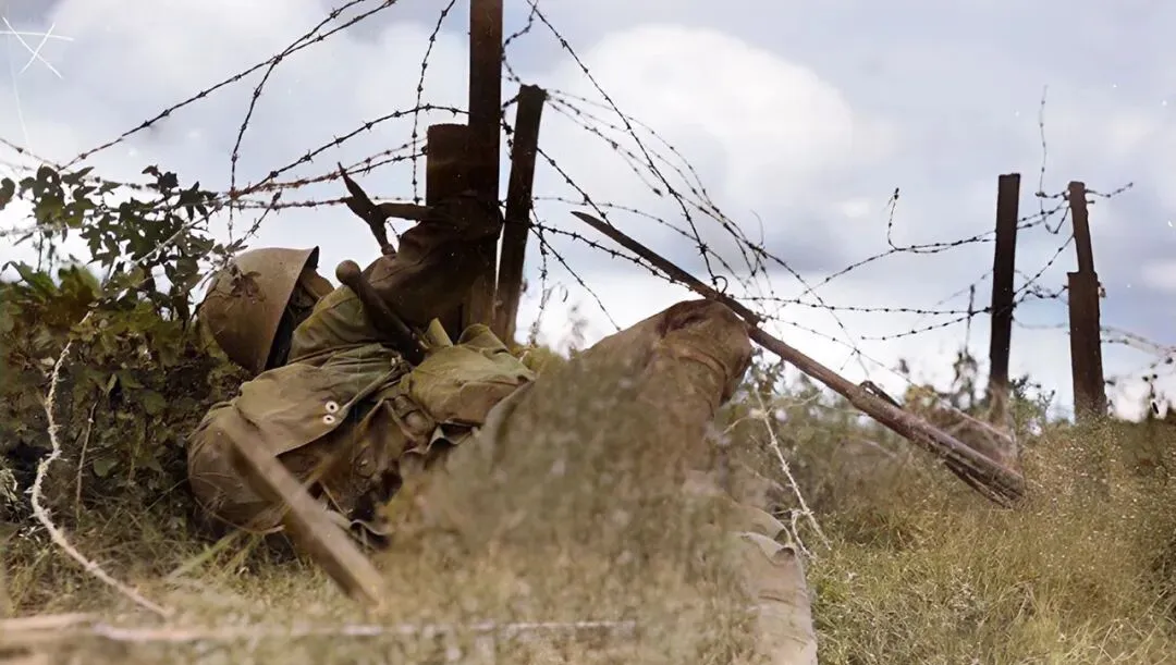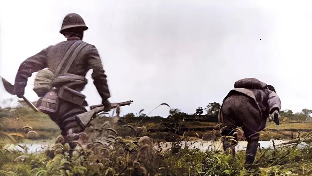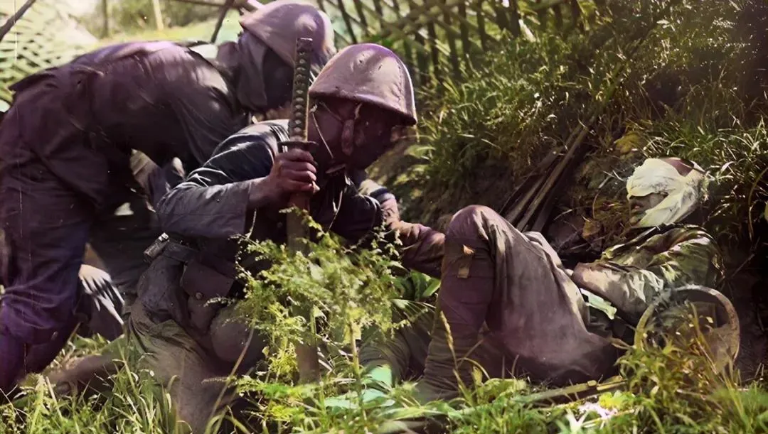 有人半躺在草窝里,头脸缠着绷带,只露出一只眼,身旁的人抓着他的衣领往上提,另一只手还护着刀柄,旁边的枪靠在野蒿上,枪口悄悄朝里。