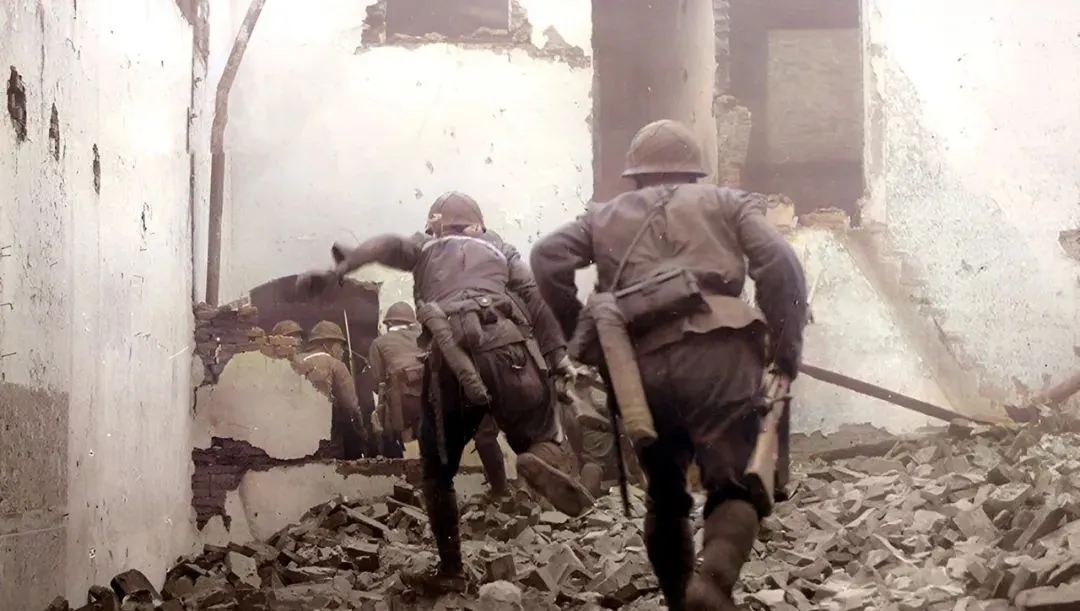 这个高耸的灰墙就是四行仓库外侧,梯子斜斜贴着弹洞累累的水泥面,攀上去的人用一只手攥绳,一只手抡军刀,墙缝里风呼呼地刮,脚下一失衡就得直直摔下去。