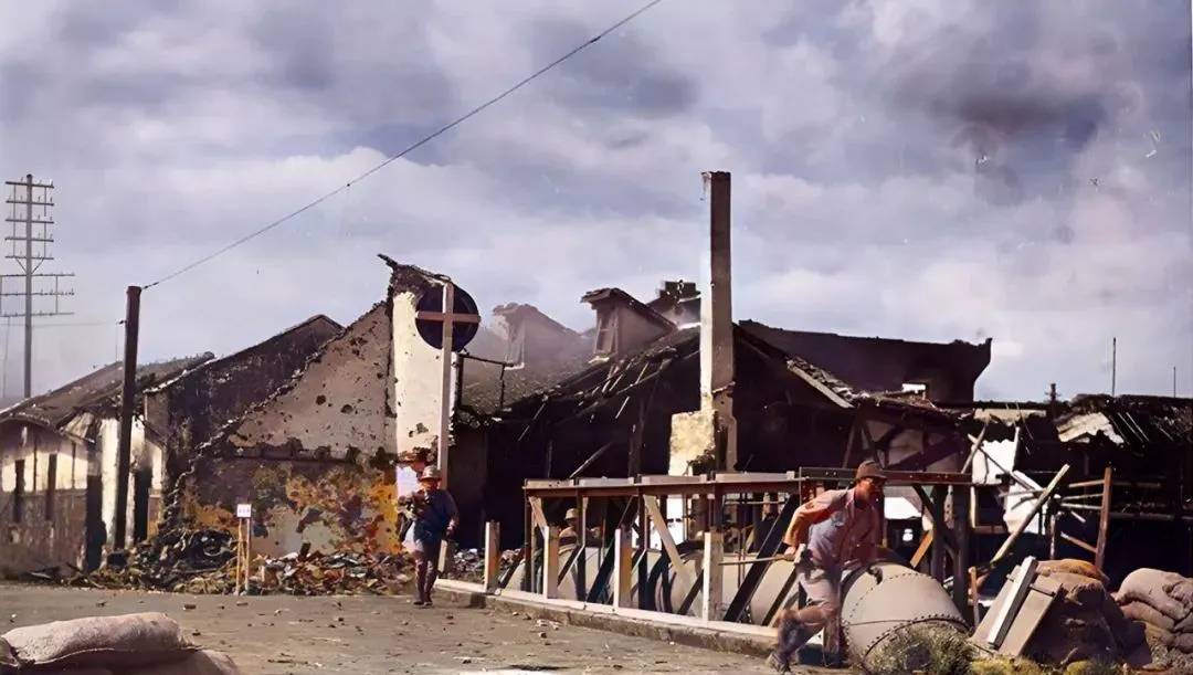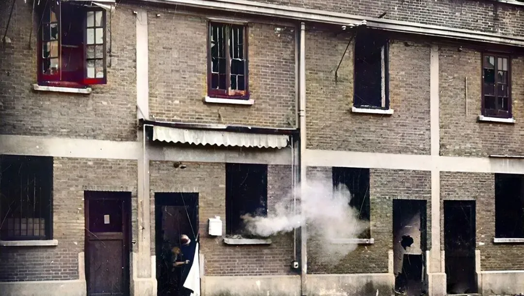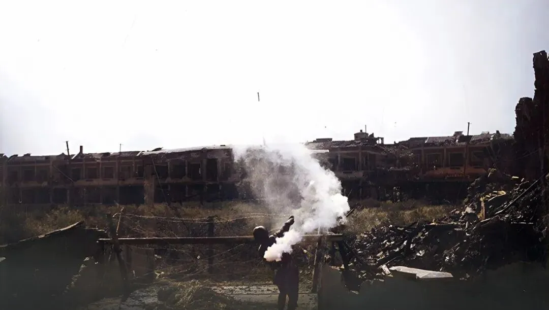这排砖楼窗框漆成红的还在,玻璃却碎了多半,墙面上新旧弹洞参差,门洞里忽地冒出一股白烟,像有人把喉咙里的怒气一把喷出来。