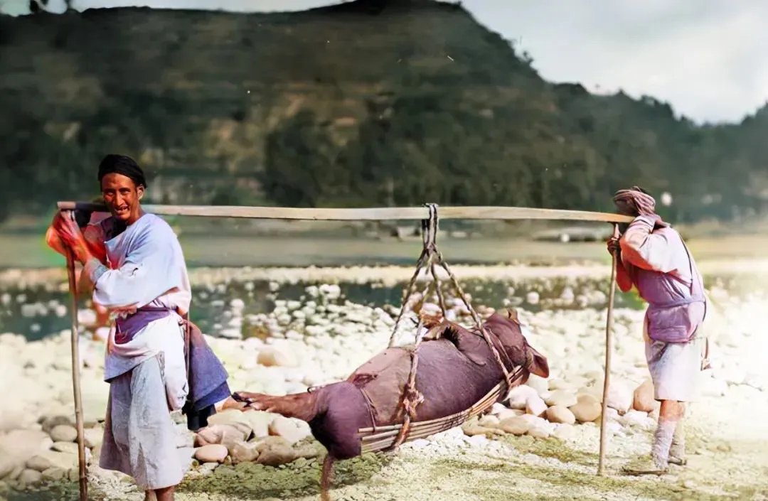 这个架子叫抬杠,中间吊着一头黑猪,前头人肩窝卡得紧,后头人手里还拄着一根歇脚棍,走累了把杠往棍上一搭就能喘口气,爷爷笑我说别嫌慢,靠脚板走出一门手艺来,现在一辆面包车嗖地过,谁还记得这门路数。