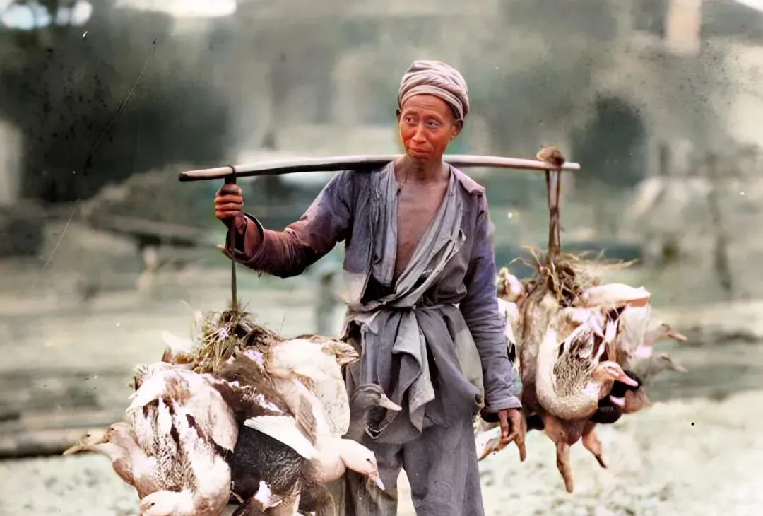 这个担子两头挂满的是家鸭,羽毛打着卷,脚跟上还粘着稻梗,挑的人把扁担往肩窝一搁,眼里都是风霜,妈妈说那会儿买鸭要捏一捏胸口的肉,手感紧实的才拎走,现在扫码一刷,讲究的是包装漂亮。