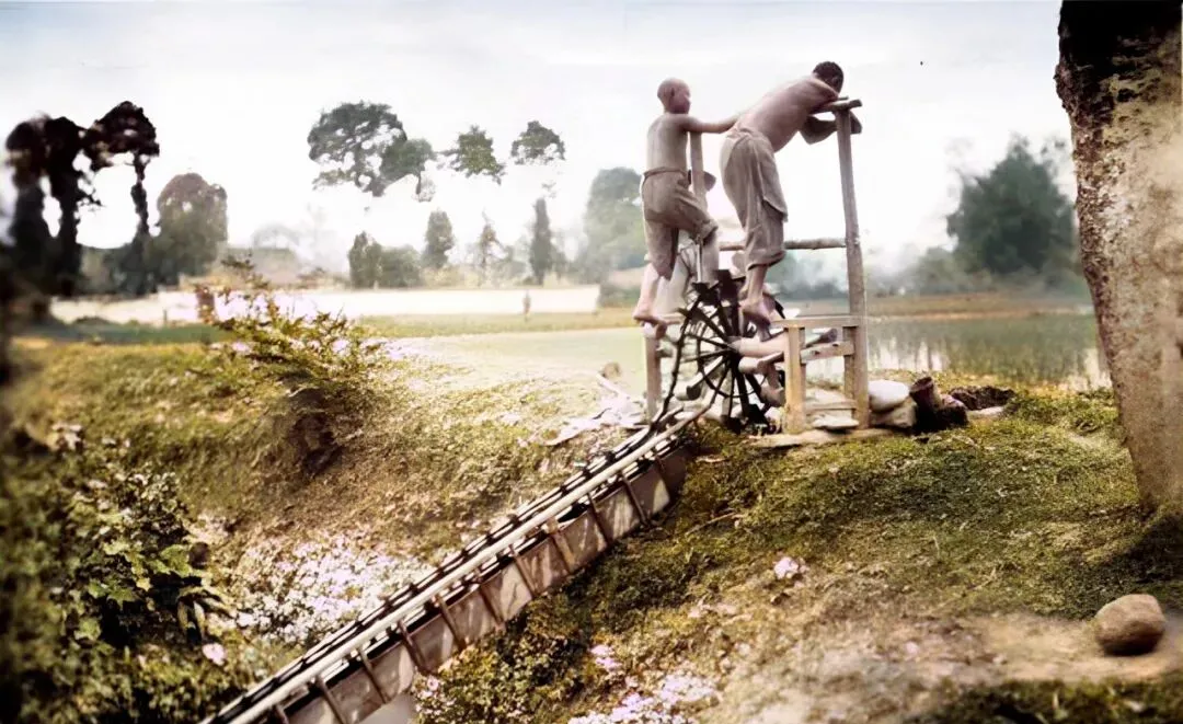 这个会吱呀转的叫脚蹬水车,两个人一前一后往踏板上踩,木齿轮带着溜槽把河水抬上田埂,外公说种烟叶最怕旱,这玩意儿一上劲,沟渠立马亮堂起来,现在喷灌管一拉,田野“下雨”跟玩似的。