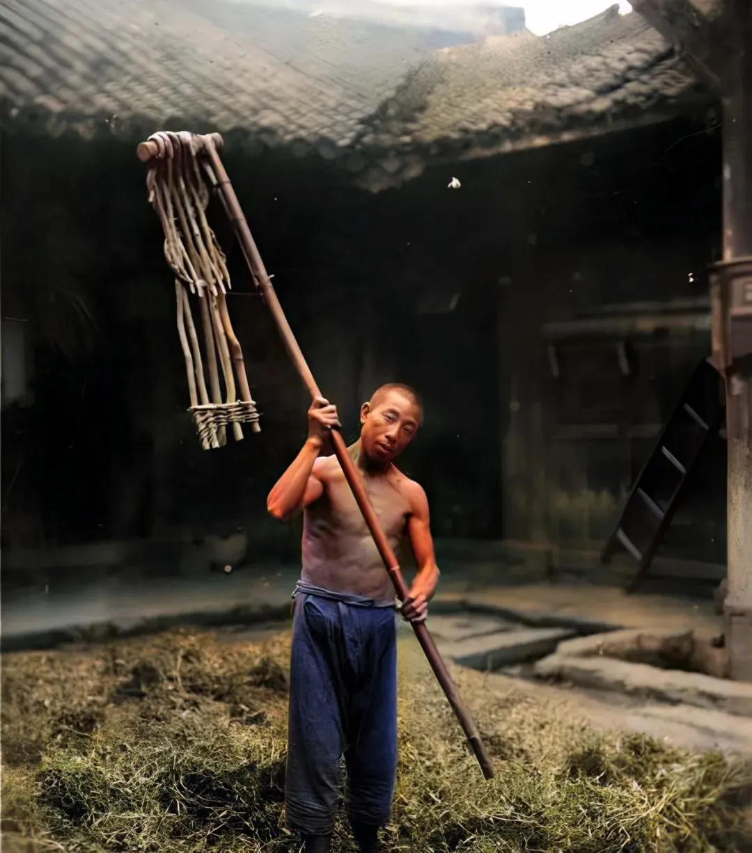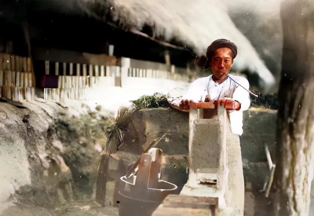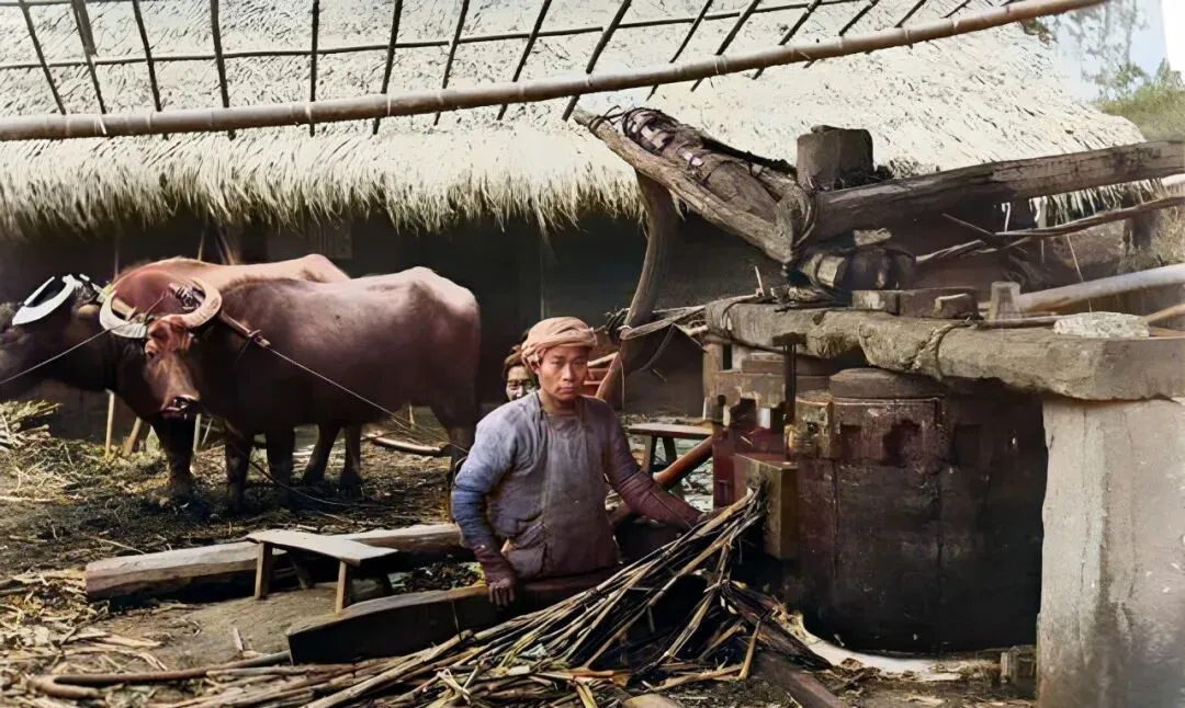 这回不是脚蹬了,是牛拉蔗榨,大木梁压着转盘,蔗渣一丢一地,伙计手臂上全是细细的纤维刺,他咂了一口烟袋说“甜得很”,我信,靠这口甜,多少孩子的年关才有红糖糕吃。