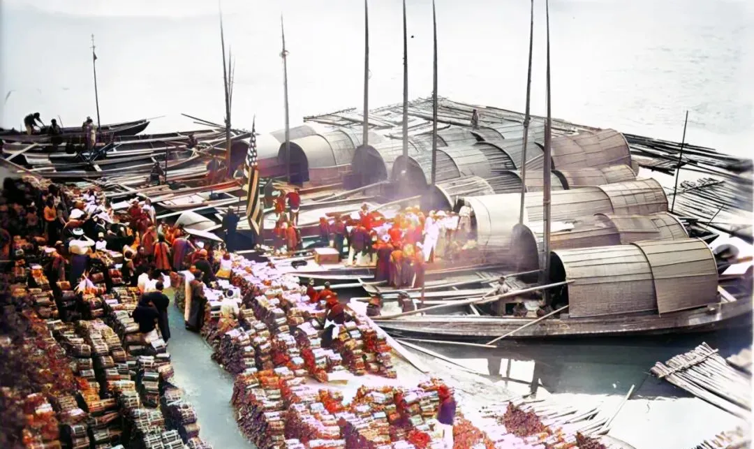 图里是江码头,船篷排得齐整,岸上一摞摞货垛像切好的年糕,商号旗子招摇,吆喝声顶着水汽往上冒,老辈人说“有水的地方,生意就活”,一点不假。