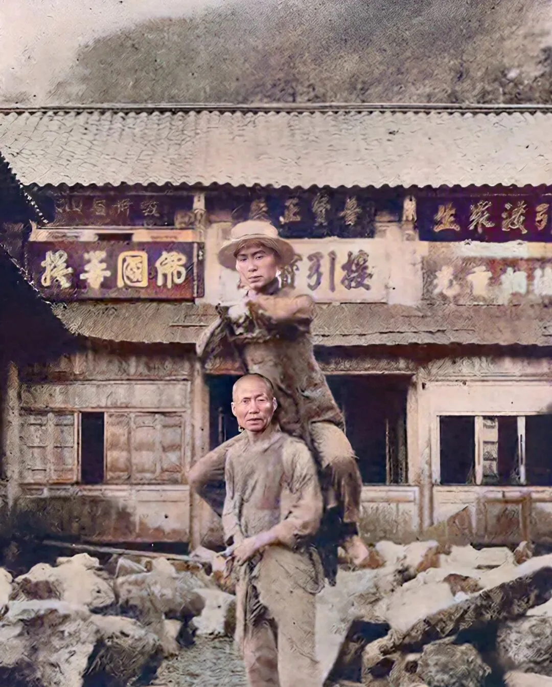 这对父子样的,是背夫进山,前头那位肩膀磨得亮,后头年轻人脚尖绷得直,门板似的背架箍在胸前,每走一步石子都在脚底打滑,现在有了索道有了观光车,这门手艺就成绝活了。