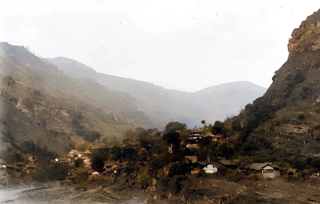 远处这片屋顶是山坳集落,房子沿着地势一层压一层,烟从树梢里钻上来,像谁在林子里偷偷烧水,公路那会儿还没修齐整,赶集得翻坡走羊肠道。