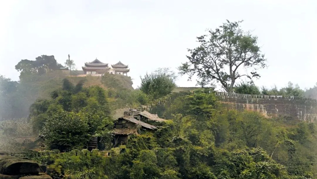 这段城墙蜿蜒着贴山势走,尽头冒出两座小阁,树林把夯土墙半掩着,阳光从缝里漏下来,像给砖缝缝了一条金边。