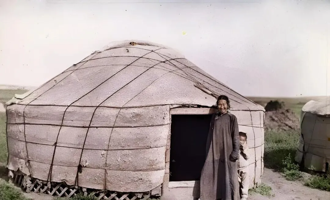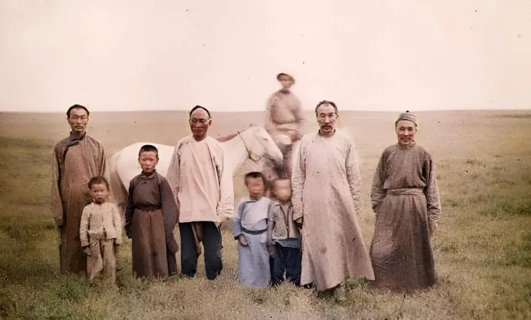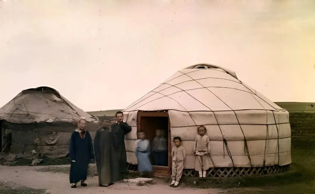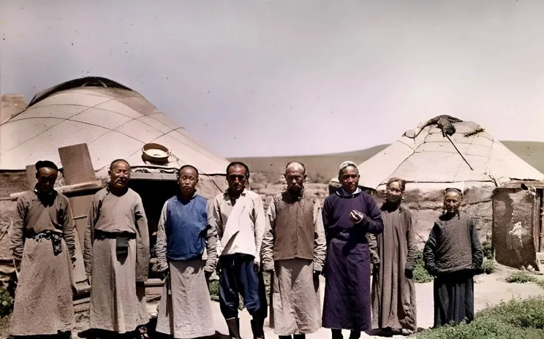 这个圆顶的就是蒙古包,外头一圈一圈勒带,门口站着一排人,衣服宽大的长袍是主角,笑容都含在眼角里,拍照这事那时稀罕,站得都挺直。