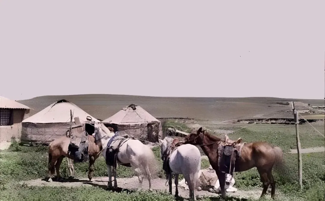 几匹马在毡包前并着马脖子,鞍具挂得齐整,尾巴一甩一甩的,地上草不高,正好塞外初夏,骑马人把缰绳绕在桩子上,进屋喝口咸奶茶。