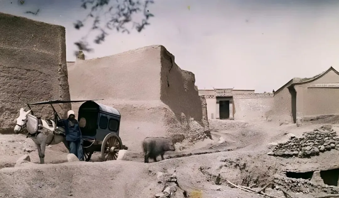 这辆两轮木车头顶有个遮棚,赶车人半靠着喘口气,一只大黑猪晃悠悠从旁边路过,尘土就跟在蹄后头飞,村口的日子就这样慢悠悠滚过去。